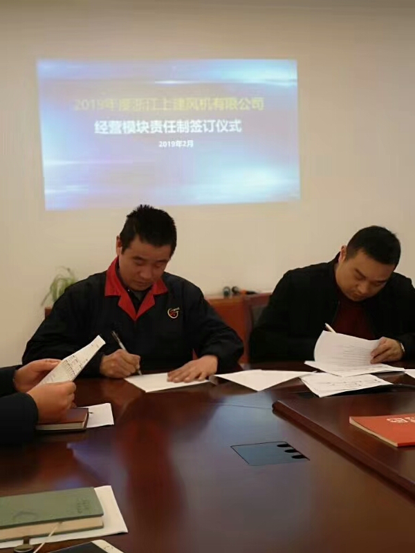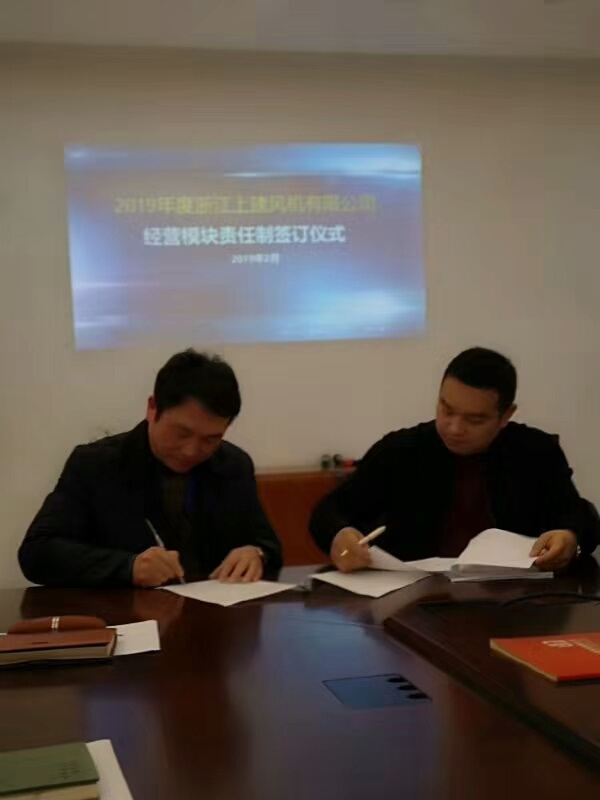 2019年2月28日,浙江上建風(fēng)機(jī)有限公司經(jīng)營目標(biāo)責(zé)任狀簽訂儀式在公司1號會議室舉行。公司總經(jīng)理童海標(biāo)、各經(jīng)營部門負(fù)責(zé)人、職能部門負(fù)責(zé)人參加簽訂儀式。