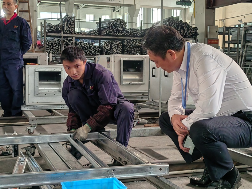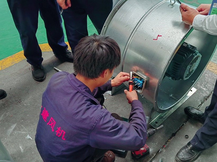 風機接線環(huán)節(jié)選手們個個斗志昂揚,動作麻利,從選尺寸,安裝,擰螺絲,調(diào)平整等各道工序得心應(yīng)手,心靈手巧應(yīng)用的淋漓盡致,讓在場觀摩的公司領(lǐng)導嘖嘖稱贊。